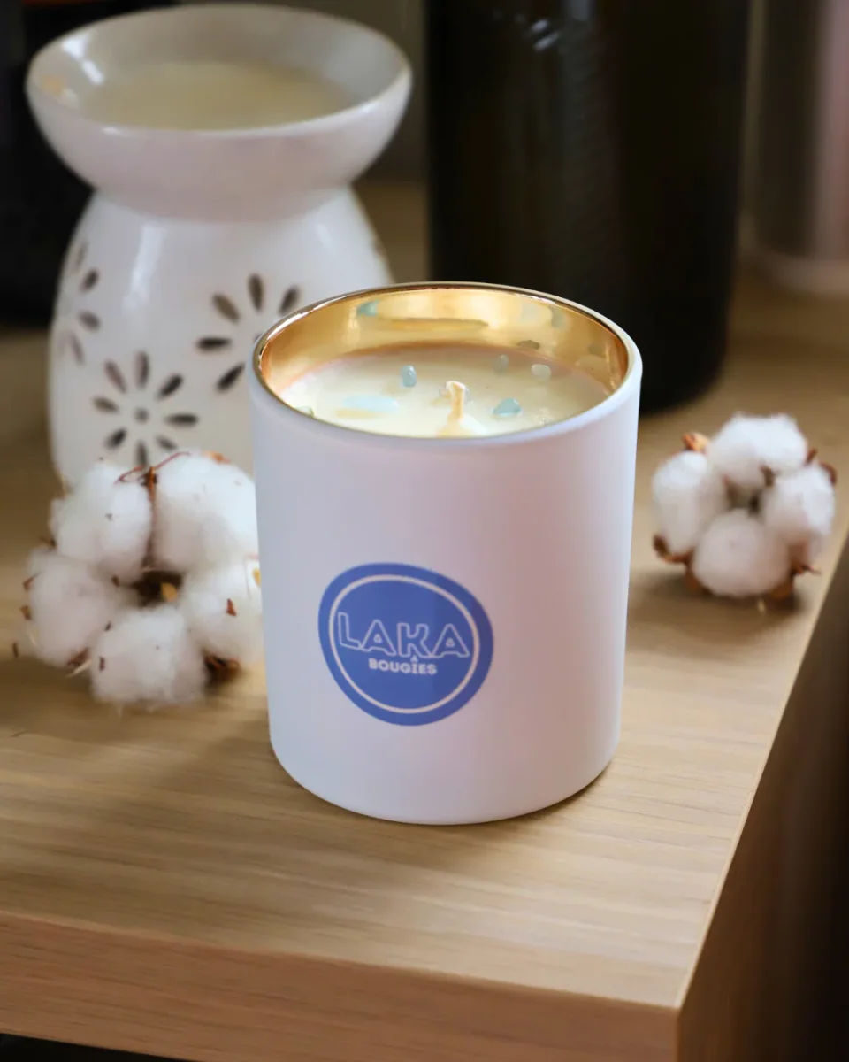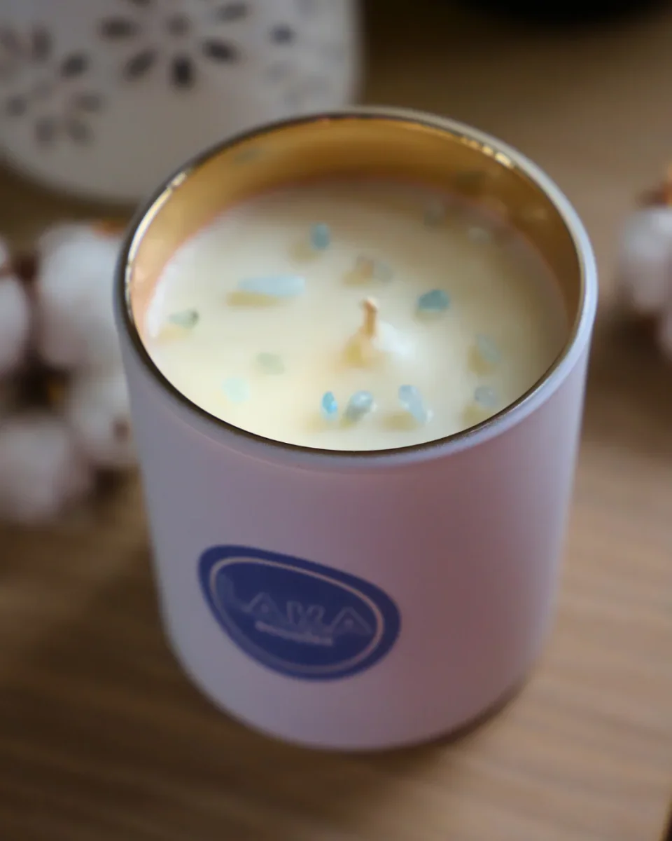 Cette bougie en pot de 200 g, composée de cire de soja naturelle, intègre des pierres d’aiguë-marine, reconnues en lithothérapie pour leur capacité à rééquilibrer les fonctions vitales et harmoniser le corps et l’esprit.
