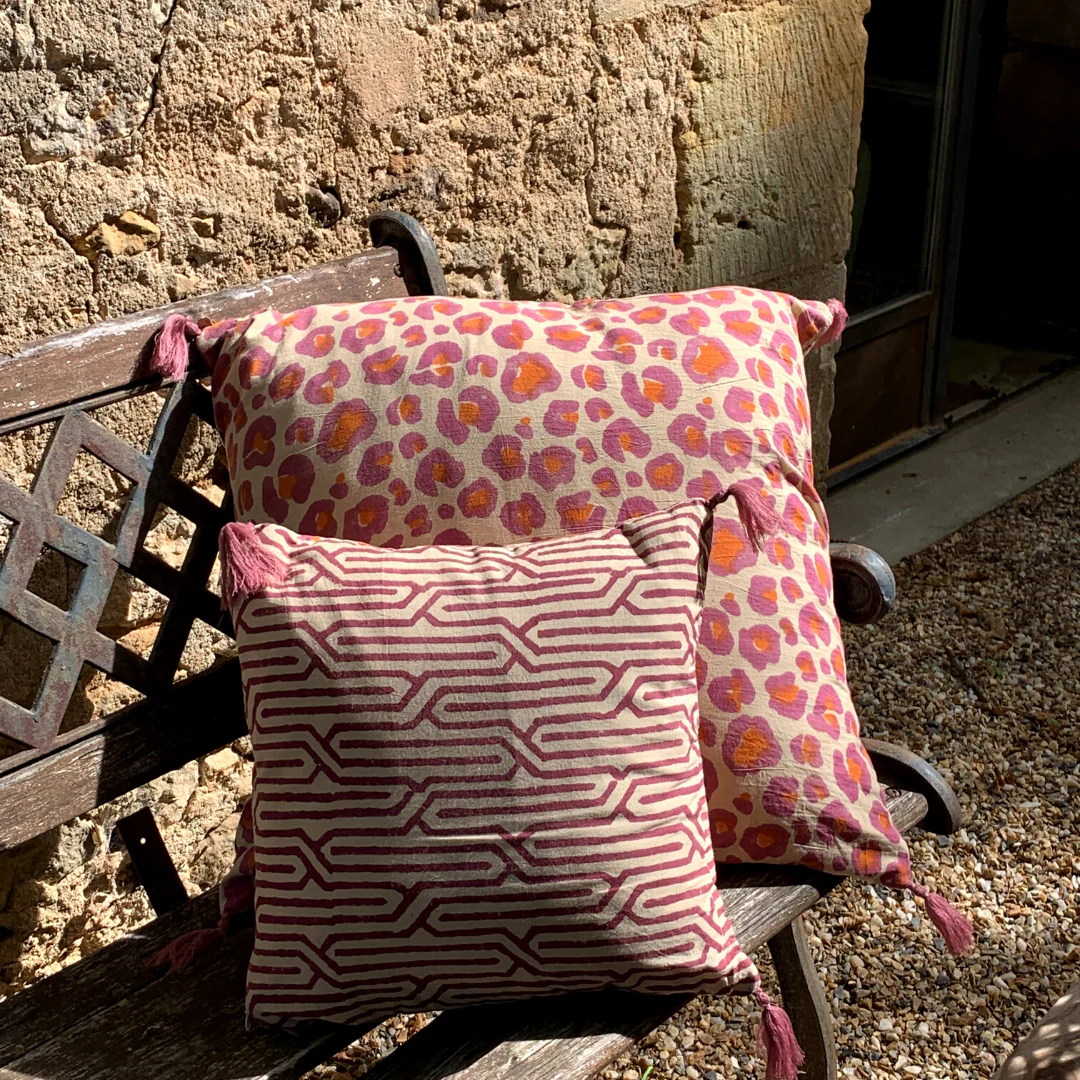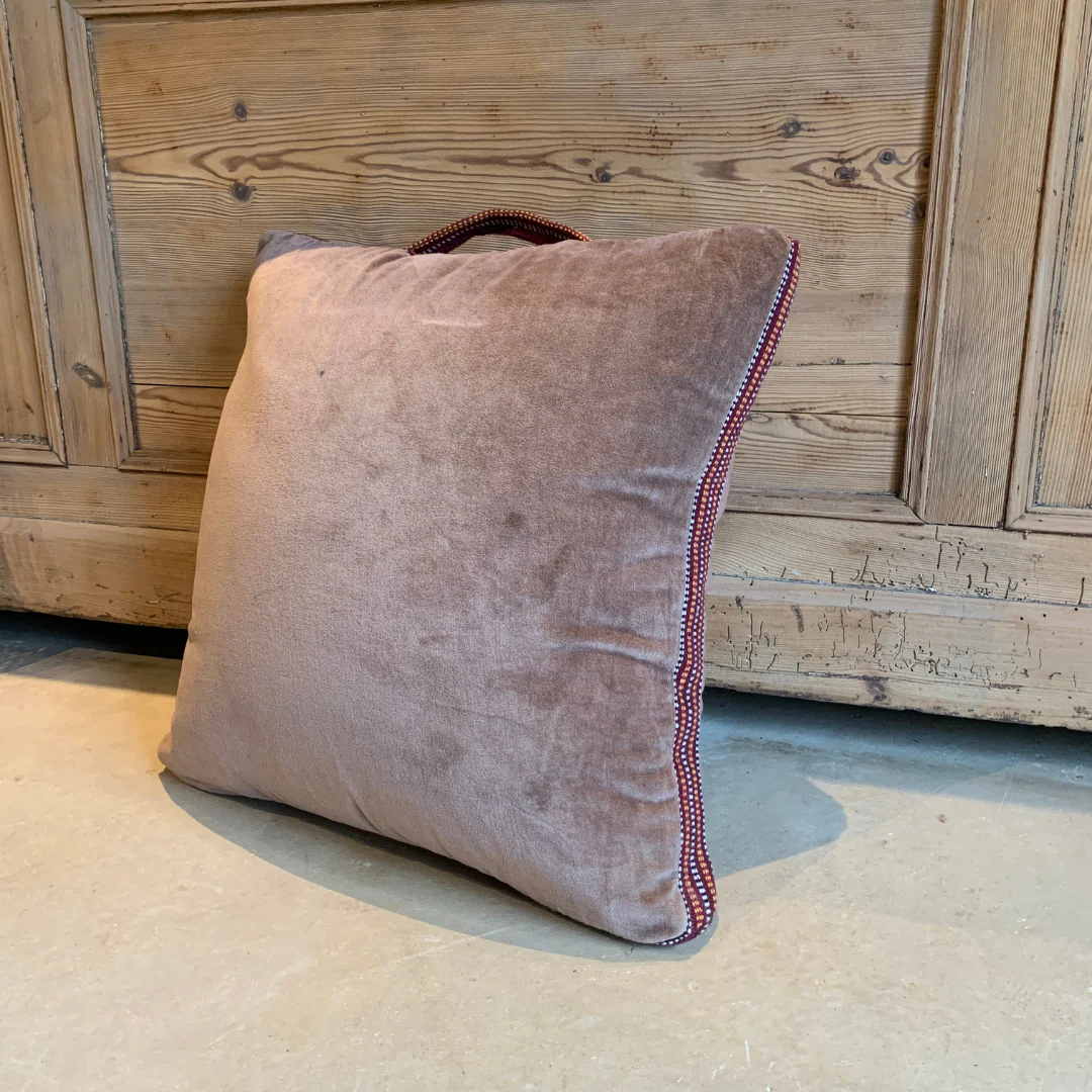 Jolis coussins en velours de coton aux couleurs chaudes et douces. Vert de gros, rose poudré, jaune ocre. Ils sont très pratiques avec leur ganse terminée d’une anse qui vous permettra de les poser sur des bancs et de la déplacer facilement. A la fois coussin d’ornement, il peuvent servir d’assise sur un banc ou une banquette.