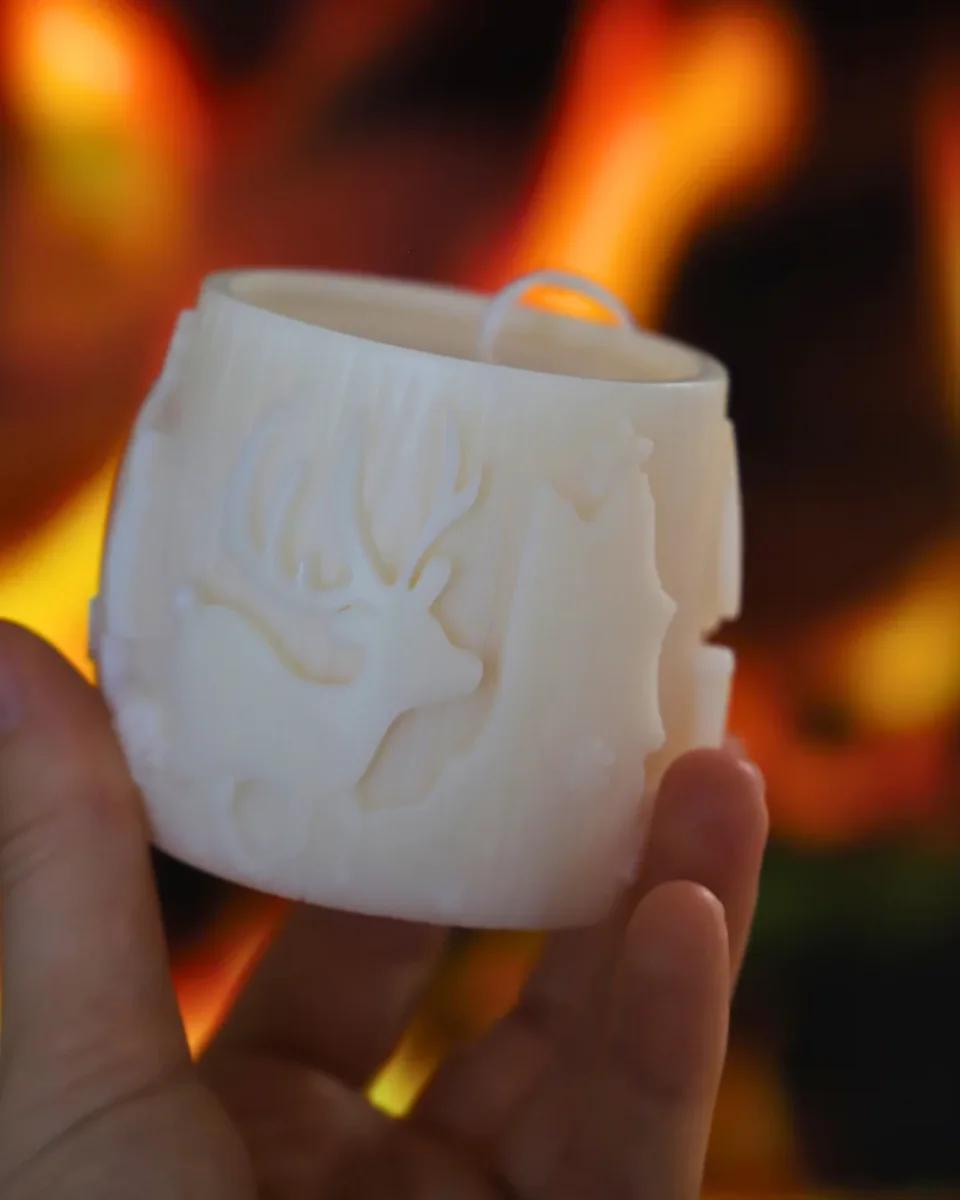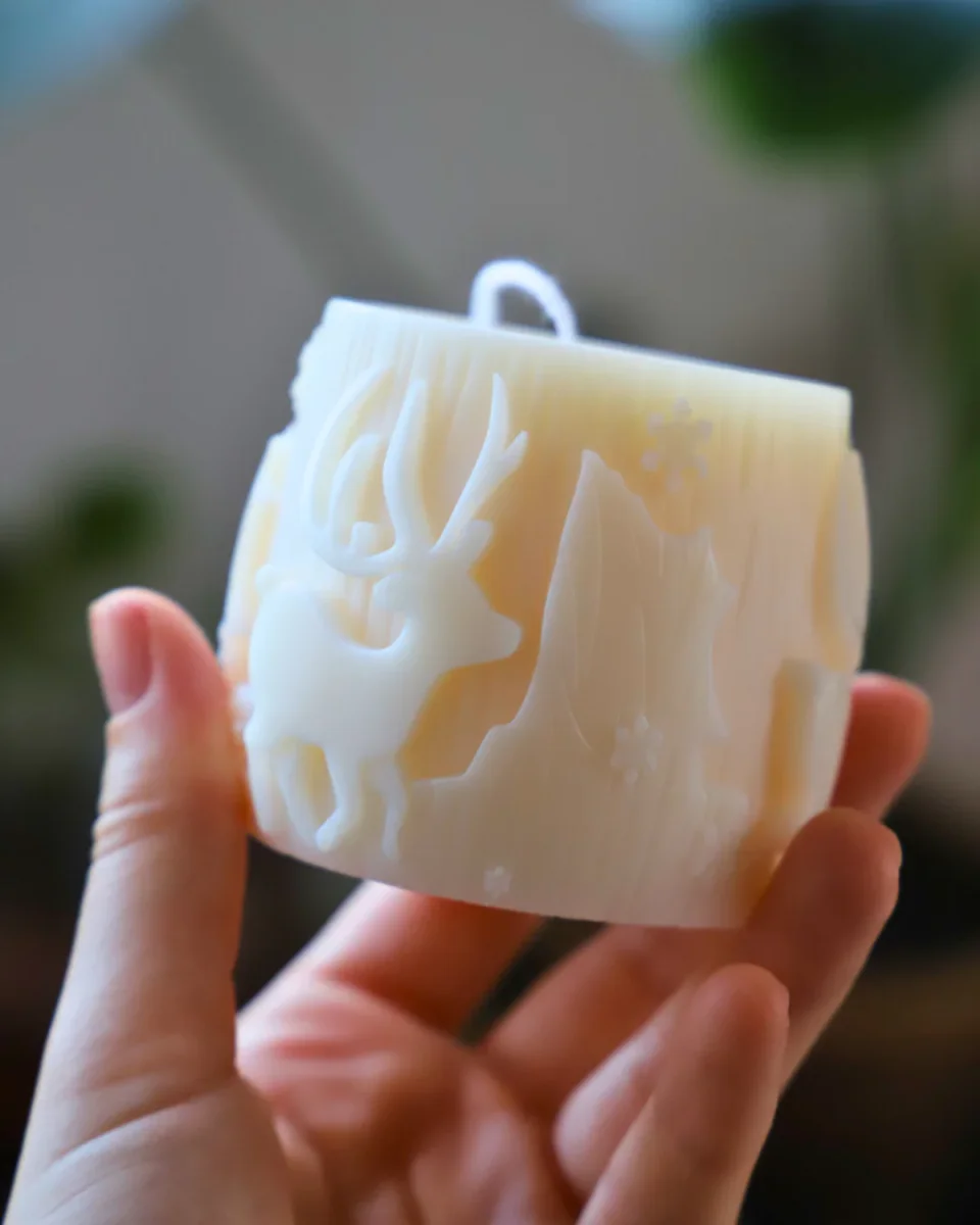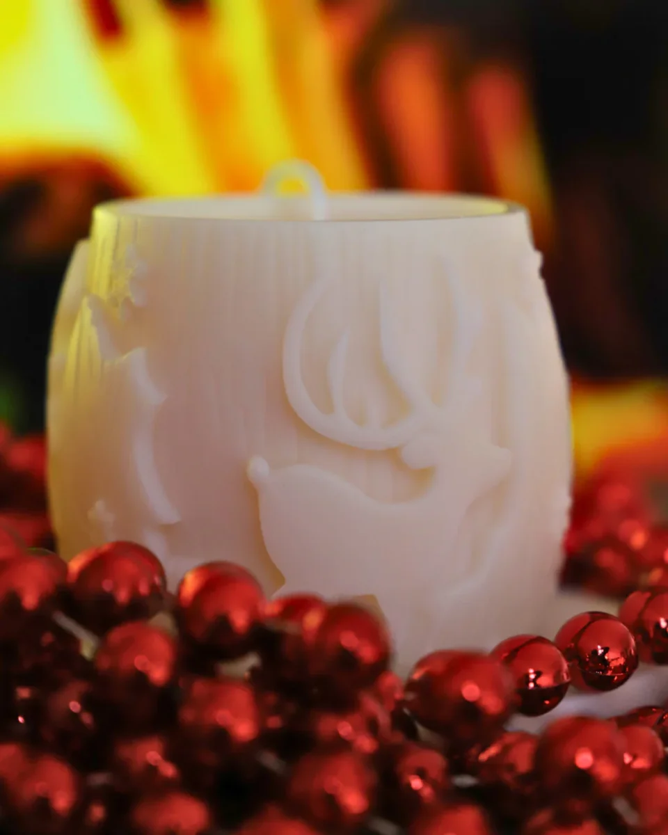 Cette bougie a des gravures dans la cire représentant une forêt avec des arbres et des rennes.