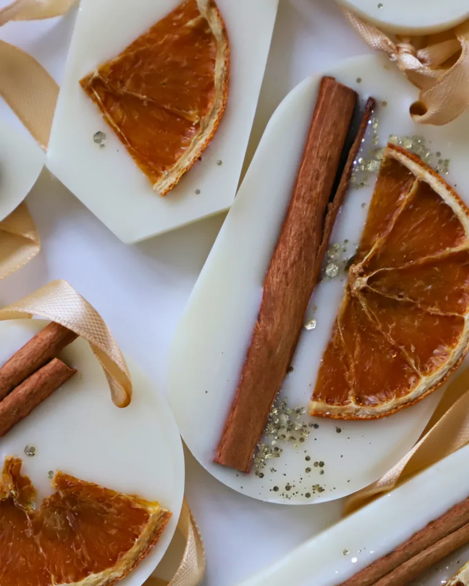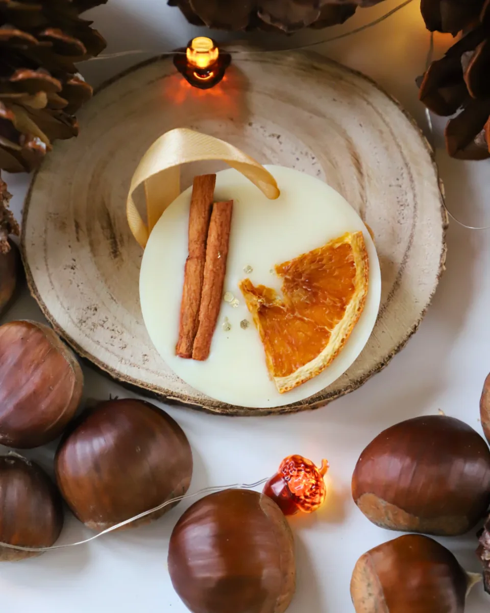 Suspensions épicée pomme-cannelle avec un morceau d’orange et de cannelle.